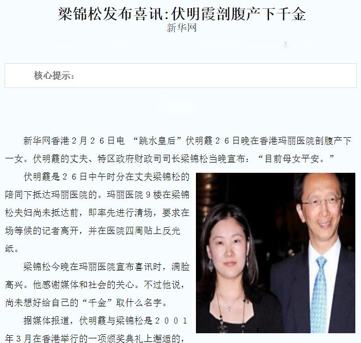 从伏明霞怀孕后,梁锦松的感情才算是告一段落。当时,伏明霞去孕检的时候,看到医院里的环境不错,就说了一句:“这里卫生挺好,以后我们就在这里生孩子吧”!