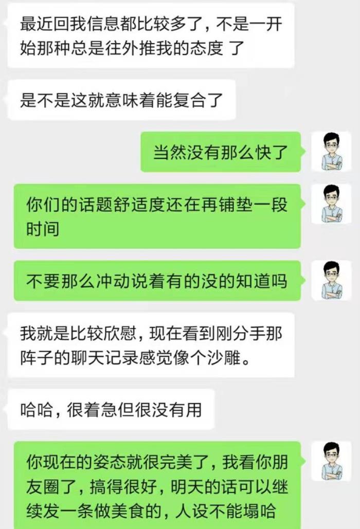这个女生的人格特质决定了她是那种“有苦不言”的人,这种人的内心需求感比普通人的更强烈,分手空窗期内,她也会有对自己感情失败的质疑和反思,但是她找不到一个发泄口,这时候我就让这个男生去做这个“知心大哥哥”,帮助她把这种否定感找到一个出口。