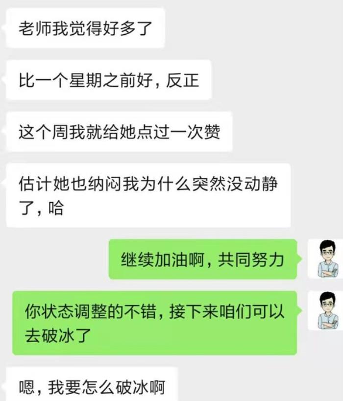 一开始女生没有回,这个男生以为她还是那种拒绝的态度,但是等了一下午之后,终于等来了女生的一个“好”字,这是这个女生分手半个月以来第一次回应,虽然内容很短,但是这是这个女生给出的一个潜意识放松戒备的信号。