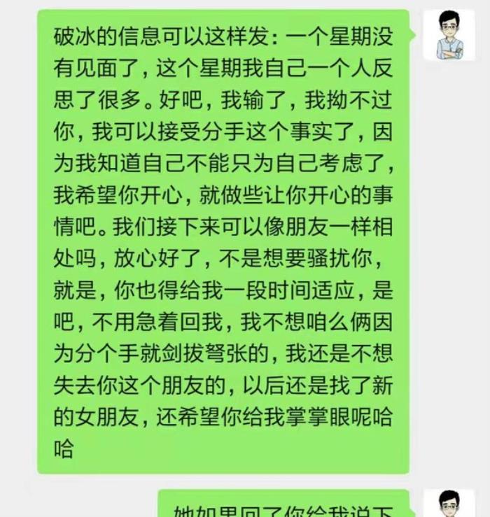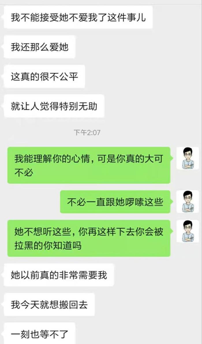 这个男生我费了九牛二虎之力,让他给自己放了一个星期的假,到外地跟哥们一起聚聚缓解下自己的心情什么的,后续的一些挽回的措施才能顺利的推进下去。