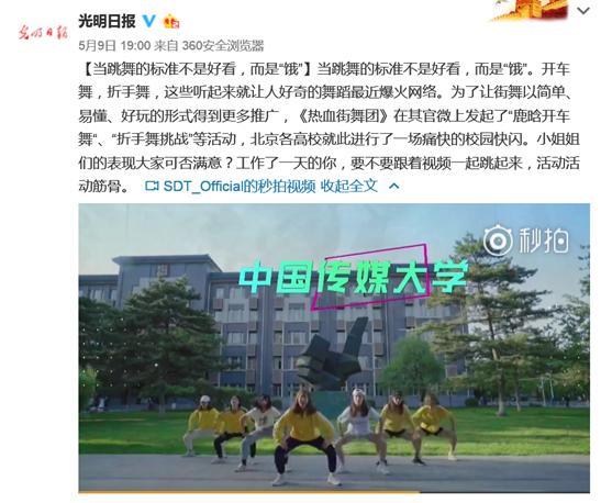 伴随着《热血街舞团》的热播,街舞文化逐渐得到普及,越来越多的年轻舞者获得了社会各界的认可与肯定,成为弘扬青春正能量的新榜样。与此同时,《热血街舞团》还主动扛起发扬街舞文化责任的旗帜,通过“鹿晗开车舞”、“折手舞挑战”等一系列简单、易懂、好玩的线上活动在各大视频平台得到积极响应,引发了不同年龄、圈层的人群争先效仿,并迅速在中国传媒大学、北京舞蹈学院等最青春、最“热血”的集结地掀起了一股街舞快闪热潮,这一系列事件还被《光明日报》点赞表扬。全国高校街舞大赛、人气舞者“惊喜大派送”、热血街舞团助力高考学子等线下活动也吸引了全国各地街舞新生力量、社会各界街舞爱好者参与其中,全民街舞狂欢的盛况一方面说明通过节目强大的社会影响力,街舞这种潮流文化已经成功突破圈层的限制,走向了大众领域,另一方面也说明街舞融入大众生活后带来了一种健康的生活方式,打造了新时代下创新发展的街舞新生态。除此之外,《热血街舞团》还开展了保护野生大熊猫活动、在“5·12汶川大地震”十周年缅怀逝者致敬重生、参与央视网“致敬先烈”活动。可以说《热血街舞团》找到了综艺节目在娱乐性之外的社会使命,肩负起时代赋予的责任,并在这方面树立起当仁不让的表率楷模。