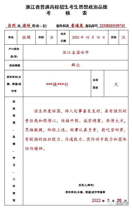 3.《浙江省普通高中毕业生登记表》,5月份由学生填写;
