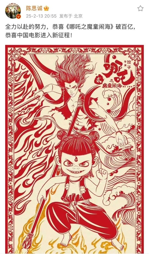 陈思诚微博祝贺《哪吒2》破百亿
