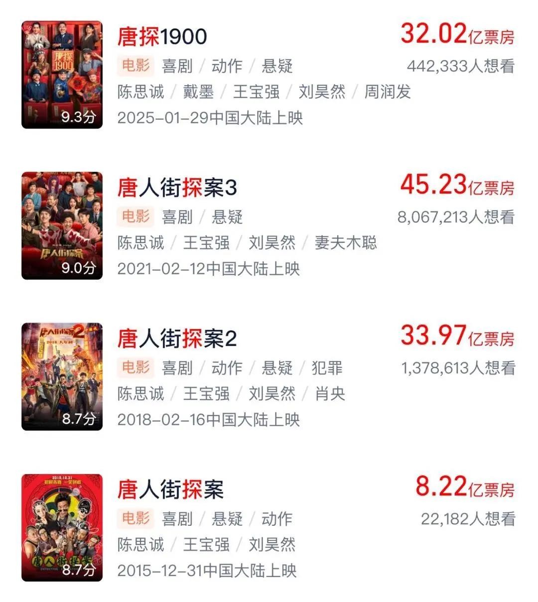而“唐探”这样的纯粹原创竟能跃升为存活超十年的IP,且屡战不败,实在是罕见。在中国商业电影中,可能只有“囧途”系列、开心麻花的部分喜剧,才能与之媲美。