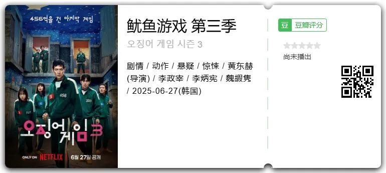 《鱿鱼游戏3》是该系列的最终章,李政宰、李炳宪、魏嘏隽、姜河那、任时完等演员将尽数回归。第三部紧紧承接第二季的故事线,以456号玩家成奇勋的反抗和001号黄仁昊的神秘过往揭开游戏背后的阴暗秘密。