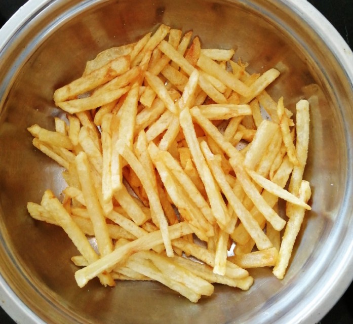 8.过了一分钟左右,明显感觉到薯条变硬了,色泽金黄了,就可以了。如下图。