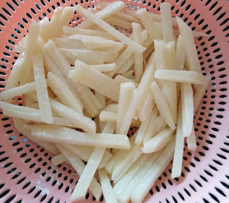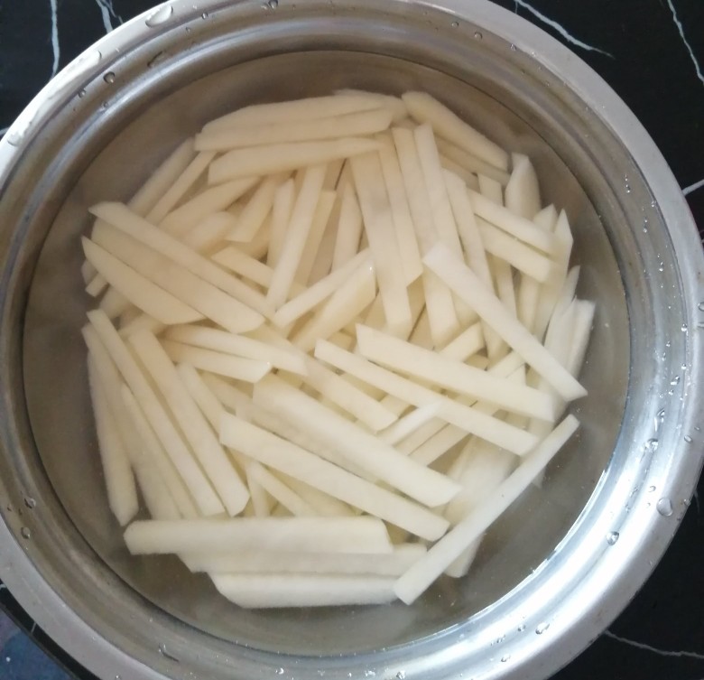 2.土豆洗掉泥沙,刮皮。切成手指粗细的长条,放在盆里洗干净。