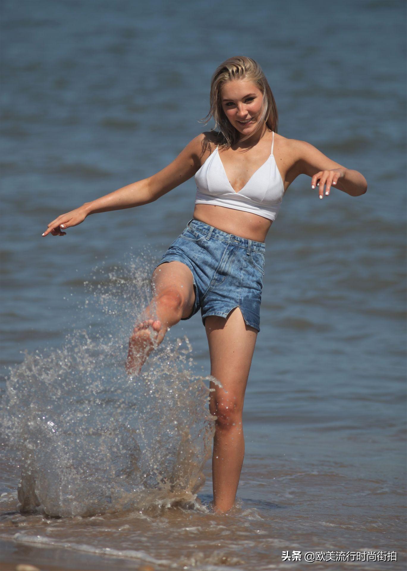 女演员安娜贝尔·格林(Annabel Greener)在海滩享受阳光