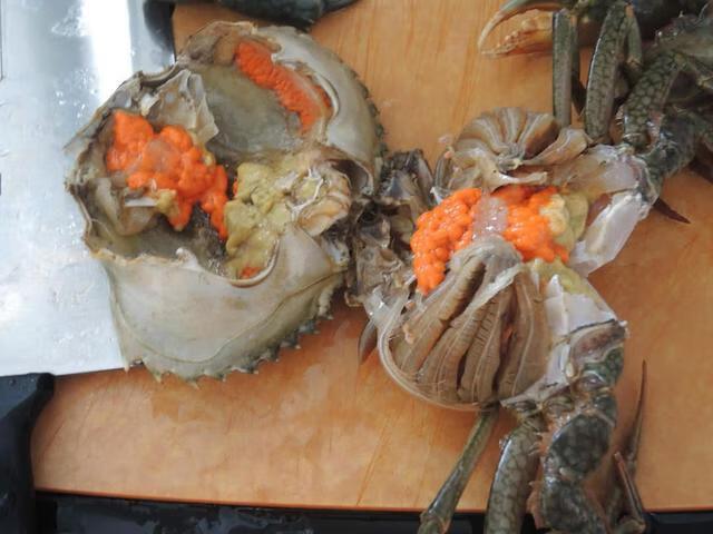6、去掉蟹心,因为蟹心它特别寒,所以不能吃。蟹心是一个白色的六角形,位于蟹中央。清理干净后,就可以做菜了。