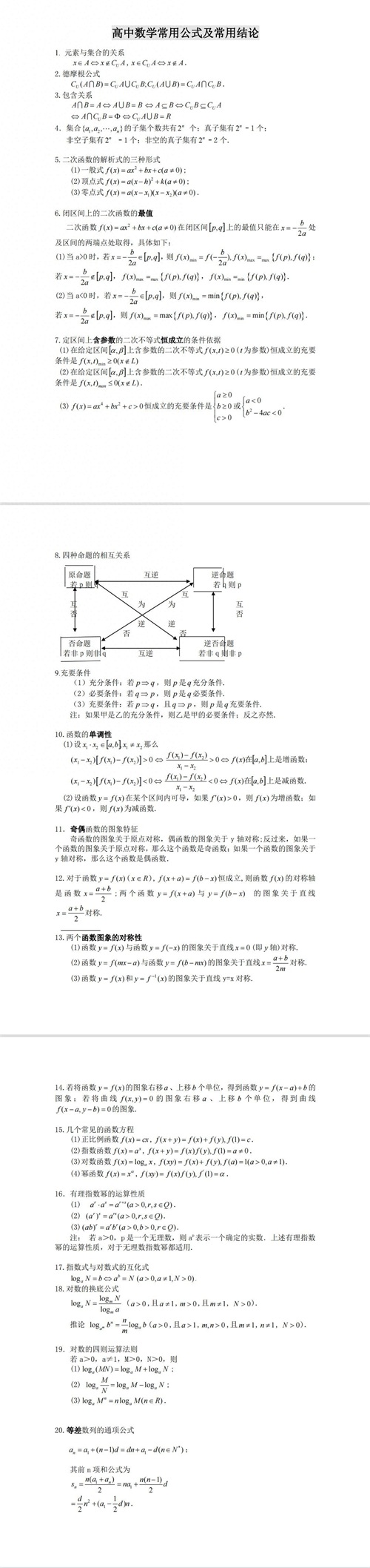 本图文主要分享高中数学常用公式及结论,图一包括集合,二次函数最值,命题关系,函数性质,指对函数公式,详看下图: