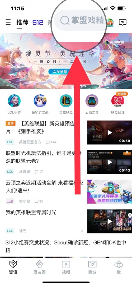 第一步:先打开掌上英雄联盟找到上方的搜索框。