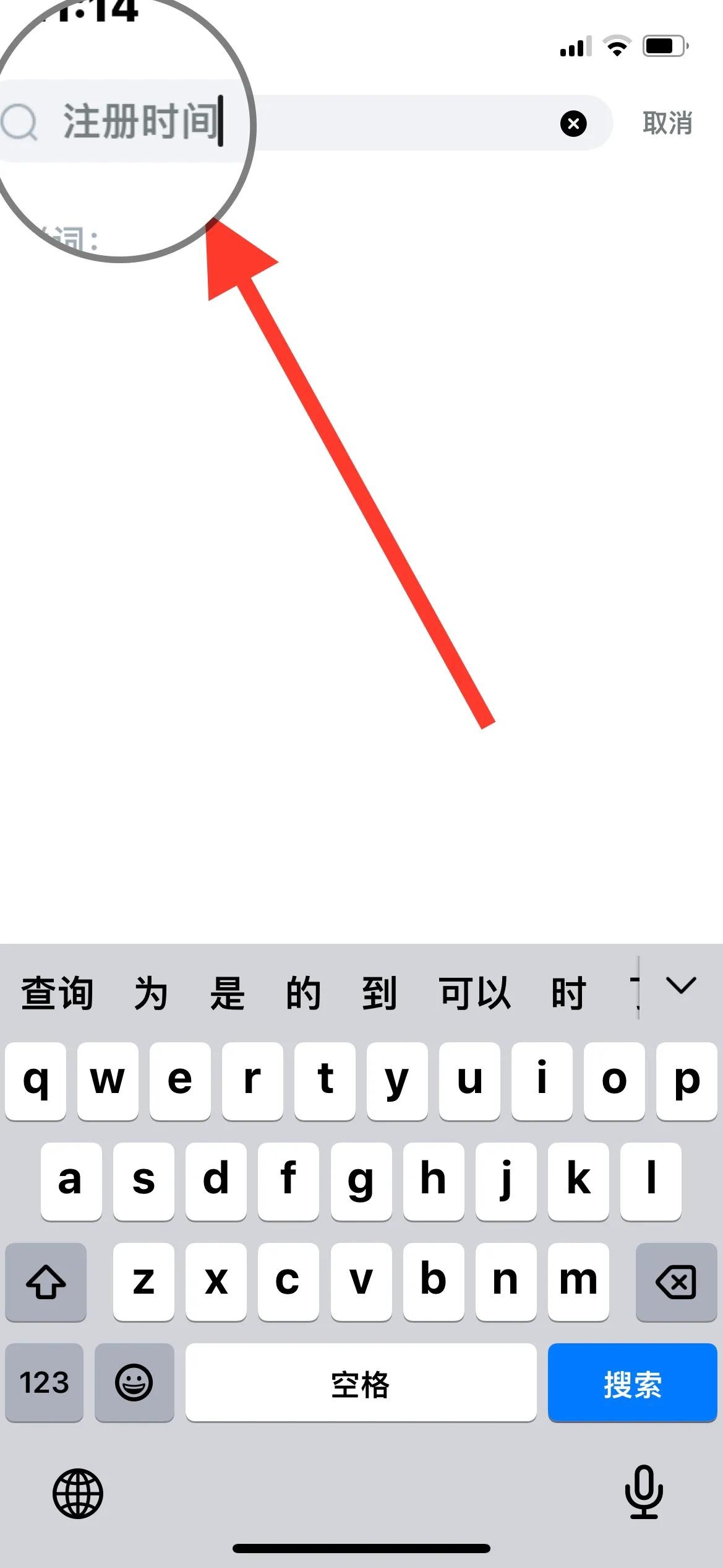 第二步:在搜索框内输入注册时间四个字点击搜索。