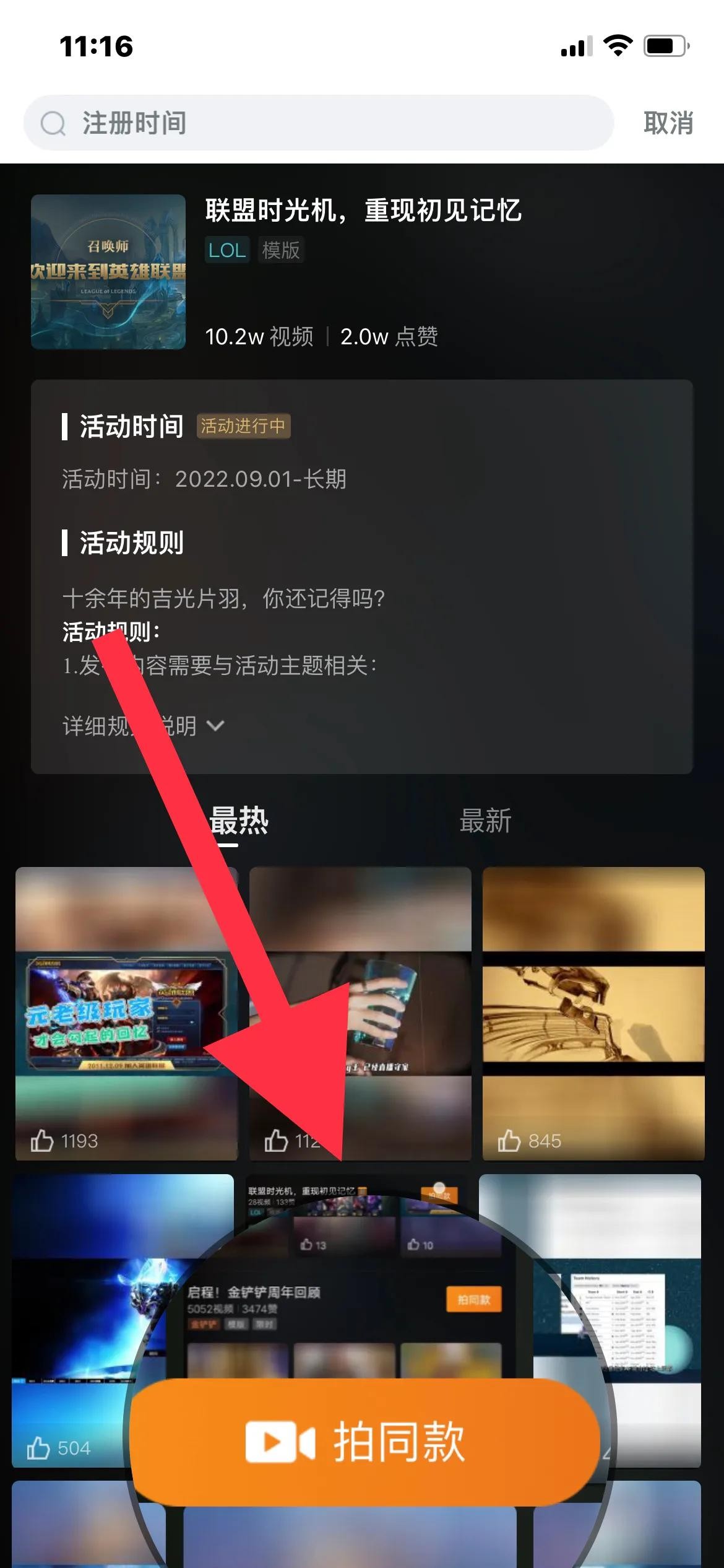 第三步:搜索完之后连续两次点击下方的拍同款按钮,耐心等待几秒钟就会自动生成一个专属于你的注册时间小视频,如果你想保存该视频到手机上就继续往下看第四步。