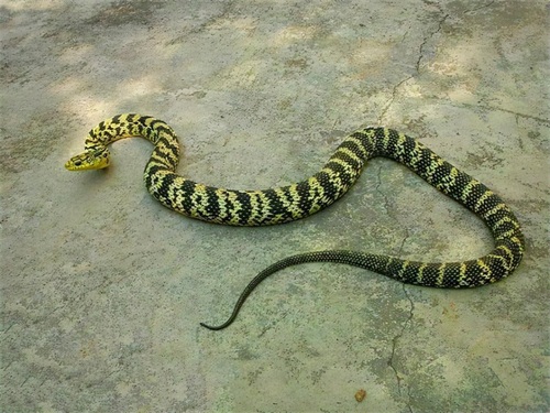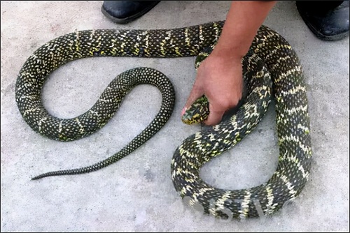 菜花蛇俗称,王锦蛇,黑眉锦蛇,主要分布在浙江、江西、安徽、江苏、福建、湖南、湖北、广西、广东、云南、贵州、陕西、河南、是典型的无毒蛇。具有突出的猎杀能力、性格暴烈、有着明显的霸权主义; 当它遇到其他蛇时,它会主动攻击。 在野外,它是一条神经质的蛇,攻击凶猛,绞杀能力强。 这是大多数蛇害怕的物种。