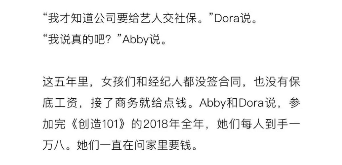 sunshine的两位成员接受了采访,她们透露一直和公司都没有正式签订合同,平时也没交社保。甚至一位成员根本就不知道公司会给旗下艺人交社保,还是记者询问才知道此事。他们曾在2018年参加了大火的《创造101》,但是最多收入只有18,000,连房租都交不起。