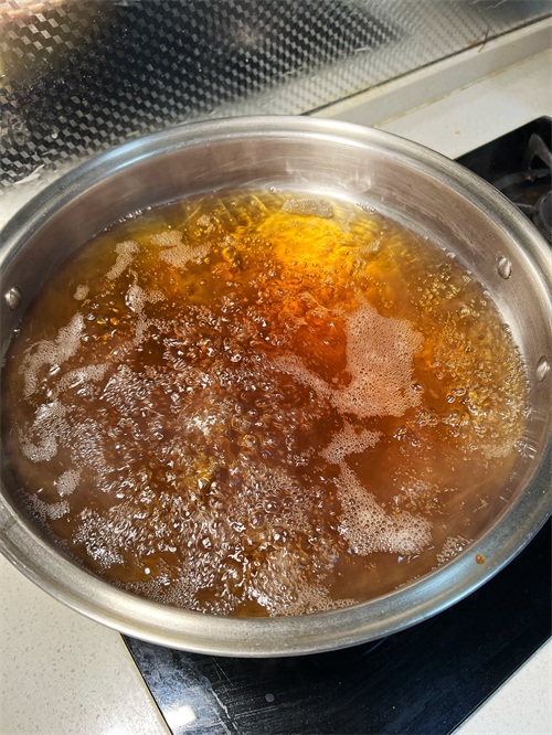 4. 接下来,准备调味料。我们需要500克冰糖、3斤纯粮酿造6度米醋(小米醋、苦荞醋均可)、3斤水、20克白酒和20克酱油。将米醋、冰糖、盐、糖等所有调味料按照比例放入锅中混合加热,煮沸后离火冷却,即为糖醋汁。