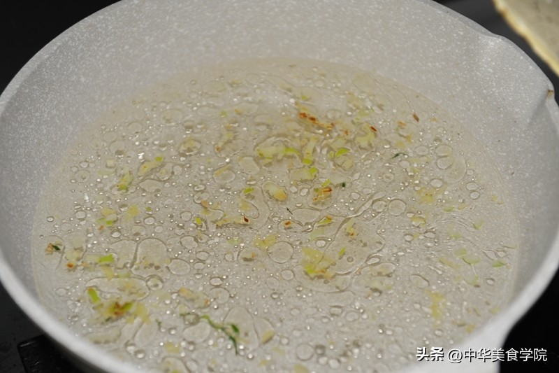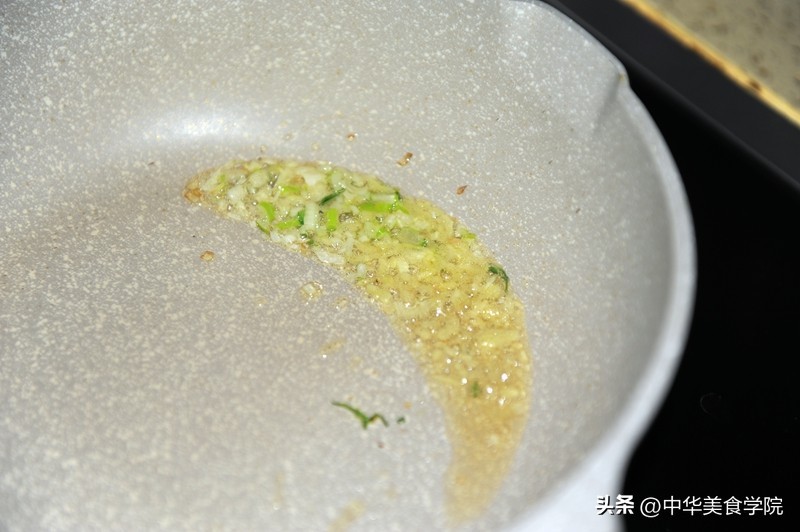 3、炒勺加少许底油,放入葱姜末炸出香气,加入适量的水烧开。