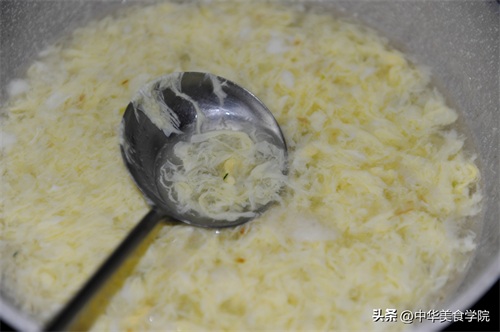 6、使汤保持开锅状态,左手拿小碗,将蛋液均匀的慢慢倒入锅中,同时右手用拿筷子迅速的在国内转圈搅动,便能形成均匀而细密的漂亮蛋花。