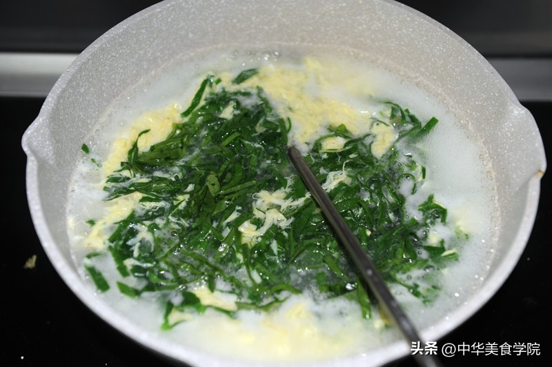 7、放入木耳菜,开锅后加入盐、鸡精,把木耳菜汤倒入汤碗,淋上香油,木耳菜鸡蛋汤就做好了。