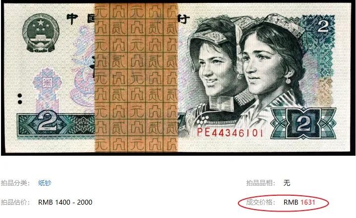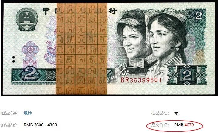 比如像上面这样整刀(100张)的80年2元,在拍卖会成交价格为4070元。