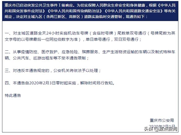 2月1日,重庆市公安局通过微信公众号发布《关于新型冠状病毒感染肺炎疫情防控期间对主城区道路实施临时交通管制的通告》称,对主城九区道路实施临时交通管制,实行单日单号通行,双日双号通行。