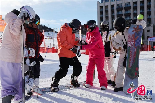 12月3日,2024“为雪而生”123大众冰雪节在北京崇礼翠云山银河滑雪场开幕,游客们在一系列精彩纷呈的活动中享受冰雪运动带来的乐趣。冰雪节开板前,单板滑雪平行回转项目冠军徐小小带领着众多滑雪爱好者一路滑行抵达现场,以榜样的力量鼓舞更多人参与冰雪活动。中国网记者 董宁 摄影