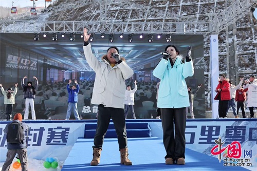 12月3日,2024“为雪而生”123大众冰雪节在北京崇礼翠云山银河滑雪场开幕。图为开板启幕仪式上,演员和开板嘉宾共同舞蹈,呼吁更多人参与冰雪活动。中国网记者 董宁 摄影