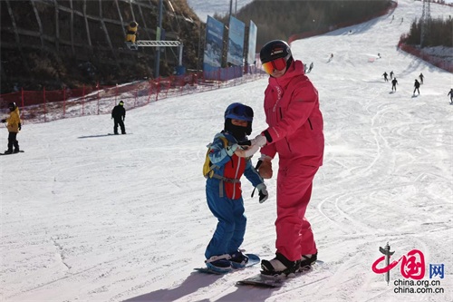 12月3日,2024“为雪而生”123大众冰雪节在北京崇礼翠云山银河滑雪场开幕。图为单板滑雪平行回转项目冠军徐小小(右)在冰雪节上教授小朋友滑雪技巧。中国网记者 董宁 摄影