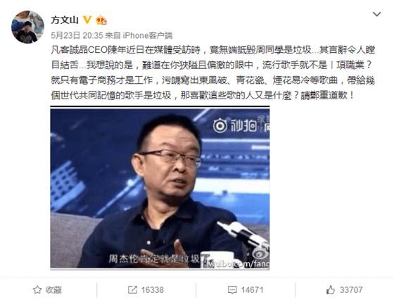 视频传出后立刻引发网友关注,连周杰伦的御用词人方文山也忍不了了,在微博发文指责陈年狭隘偏激,要求其郑重道歉。此外演员袁立也称这样类比太不适当,称陈年太傲慢无知。