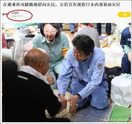 经查证,这些都是多年以前的老照片。一查之下就能发现,安倍夫妇这组,是在2018年7月日本西部暴雨期间,前往避难所双膝跪地慰问灾民时拍的。