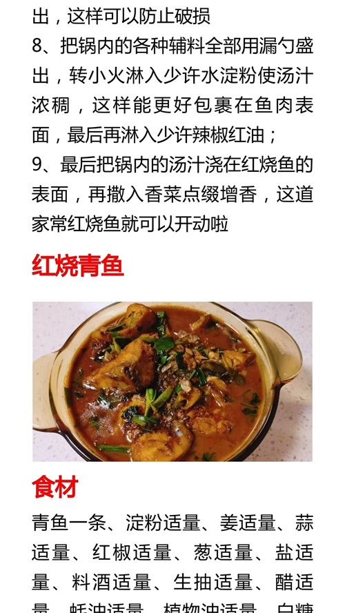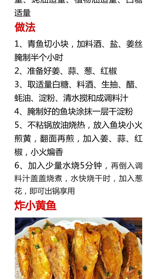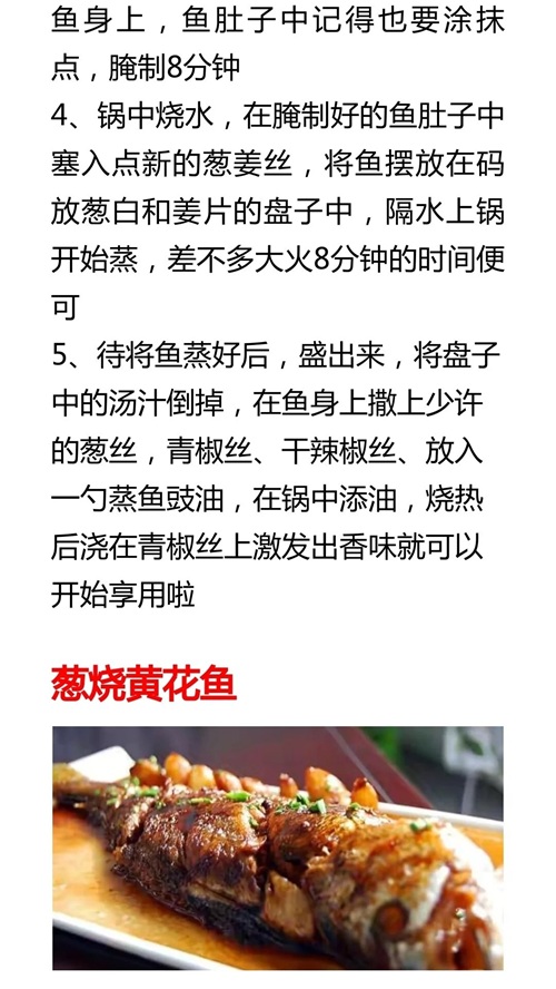 下面是红烧鱼、红烧青鱼、炸小黄鱼、酸菜鱼、鲫鱼豆腐汤、清蒸鲈鱼、葱烧黄花鱼、蒜子啤酒烧鱼块、花椒鱼片的做法及配料!