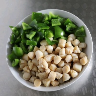 3、将扇贝柱沥干水分,青椒洗净切块备用。