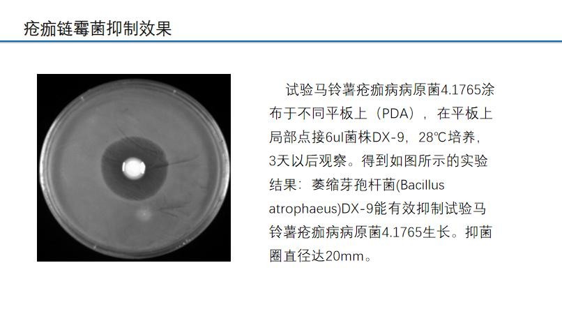 中国科学院微生物研究所专利菌株DX-9对疮痂链霉菌有非常强的抵抗效果,而且具有防治土传病害、解磷解钾、疏松土壤、生物固氮、生根促根、提高成熟期果实着色、促进植物进行光合作用、保花保果、改善品质等功效,是改良土壤、防病增产、改善作物品质的首选产品。
