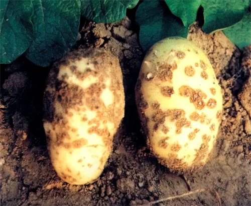主要侵染块茎,块茎表面先产生圆形至不定形木栓化疮痂状淡褐色细小隆起的病斑或斑块,扩大后形成褐色圆形或不规则形大斑,因木栓化使病斑表面质感粗糙,后期中央稍凹陷或凸起呈疮痂状硬斑块,病斑有扁平、凸起、深裂、网状四种类型,病斑仅限于皮层,不深入薯内,有别于粉痂病。但被害薯块质量和产量仍可降低,不耐贮藏,且病薯外观不雅,商品品级大大下降,造成经济损失。