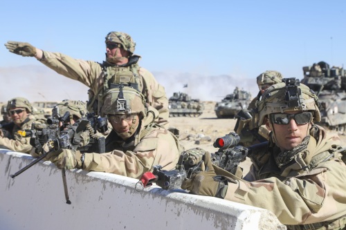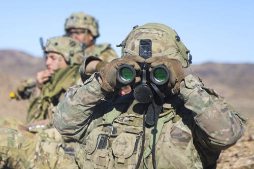 2020年2月11日,位于美国加利福尼亚州南部巴斯托市东北60公里处的欧文堡美国陆军训练中心,美国陆军每个月都要在这组织一次师、旅规模的演习。照片中的美军士兵并没有像其他演训的美军一样佩戴臂章,无从得知是那支部队。
