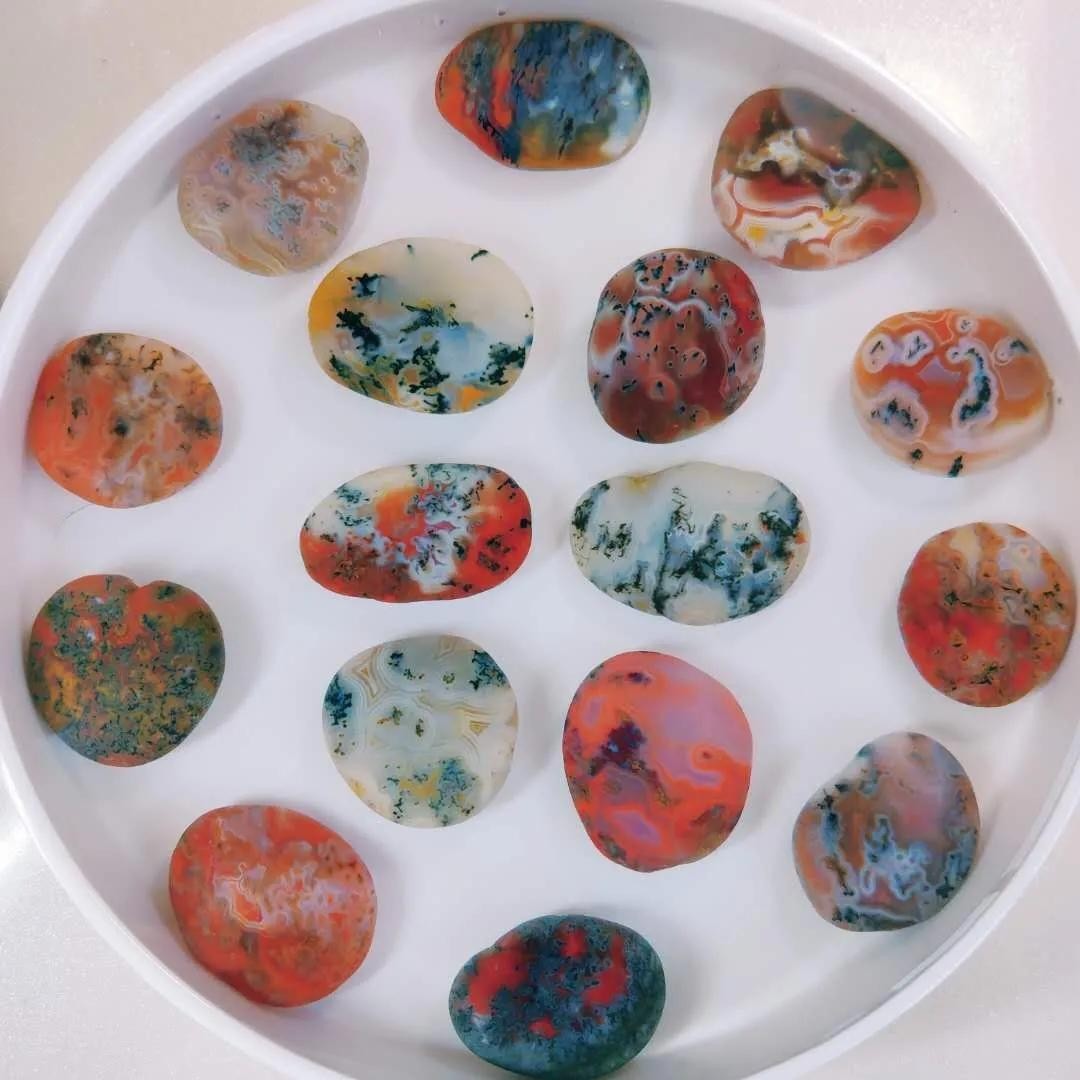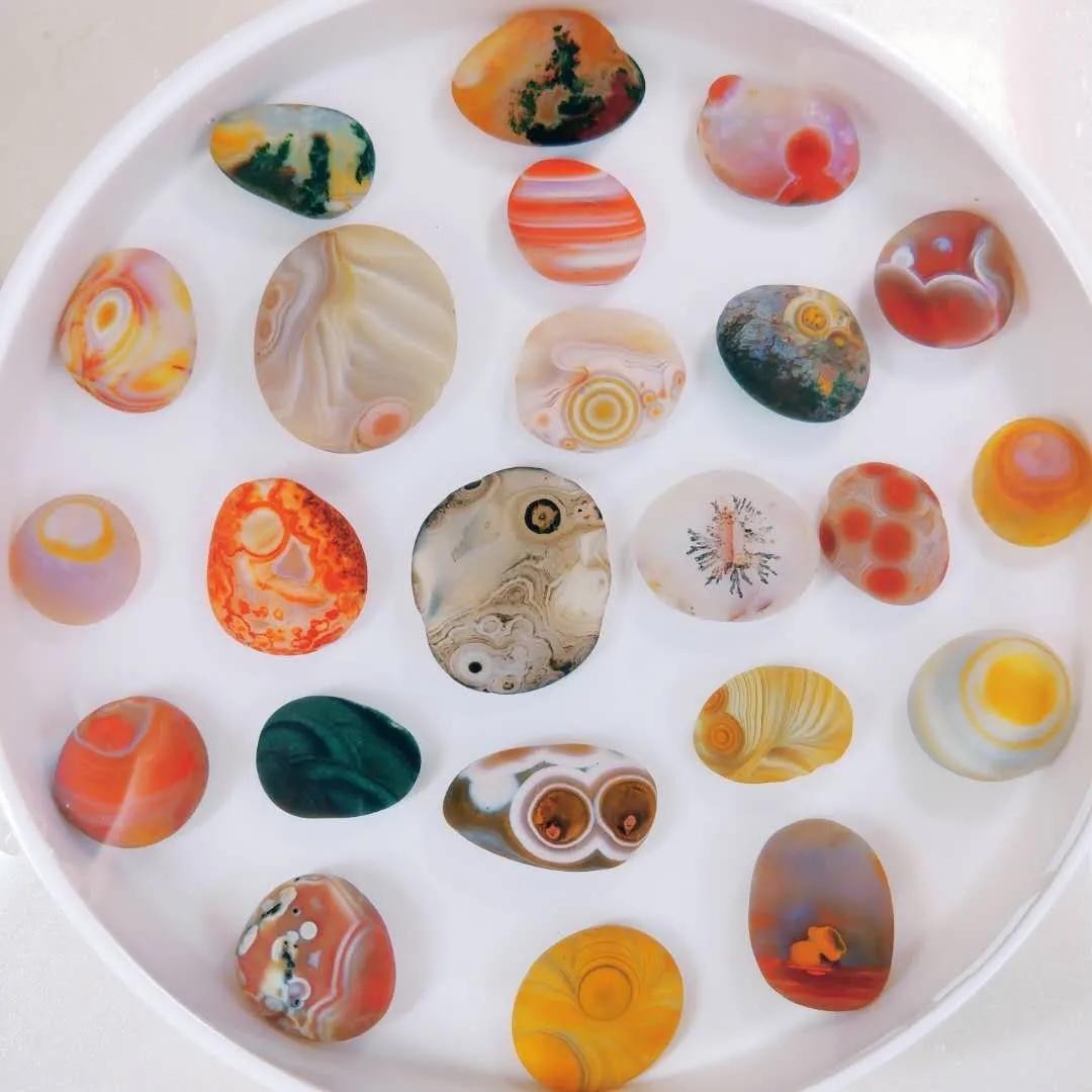 上图这盘是雨花石彩石,颜色也很艳丽,但不是玛瑙质地。