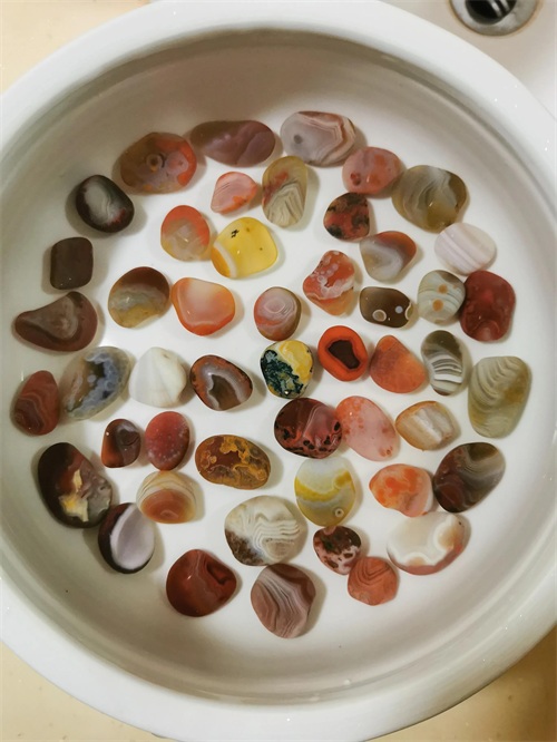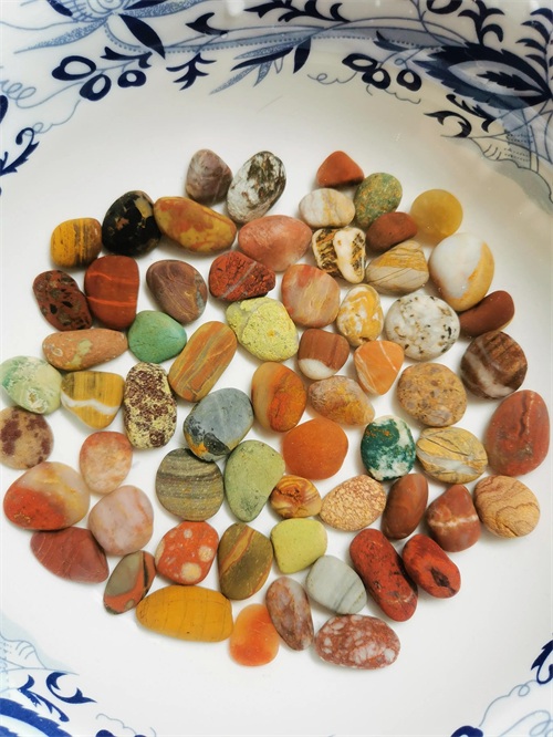 雨花石分为粗石和细石,粗石为一般彩石,细石为玛瑙石。差不多1000块石头中才有一颗玛瑙石。