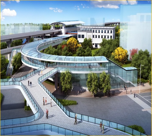 武汉新荣轨道交通换乘工程连接轨道交通1号线新荣站和阳逻线一期工程新荣客运站两座站点,项目北接阳逻线新荣客运站B出入口,沿后湖大道出地面后,与市政过街天桥合建沿解放大道人行道上方布设至1号线新荣站,并于1号线新荣站端头新建换乘厅,与换乘天桥相接,实现阳逻线新荣客运站与1号线新荣站的付费区换乘。整个换乘通道包括地下段、地面段、天桥段及换乘接入厅四个部分。