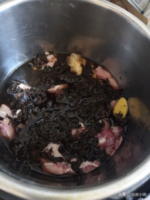 3.放高压锅里炖的,炖了35分钟,放肉,葱姜蒜,大料,酱油老抽,料酒,梅干菜,水刚好没过(除了肉菜,我用了个化妆棉把其他东西包起来做了料包)