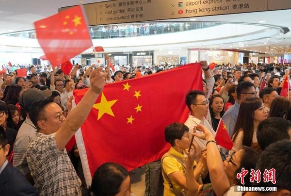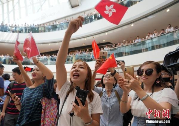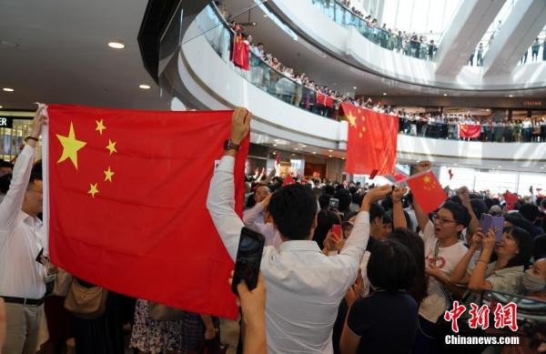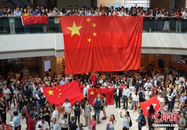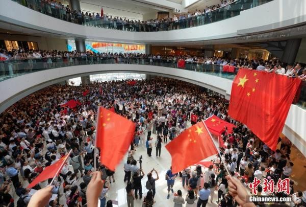 9月12日中午,众多市民来到香港国际金融中心商场中庭,参加“快闪齐唱国歌”活动。一面巨大的中国国旗悬挂在中庭,参与者手持五星红旗和香港区旗,高唱《义勇军进行曲》和《歌唱祖国》等爱国歌曲,并高喊“中国加油”等口号。中新社记者 张炜 摄