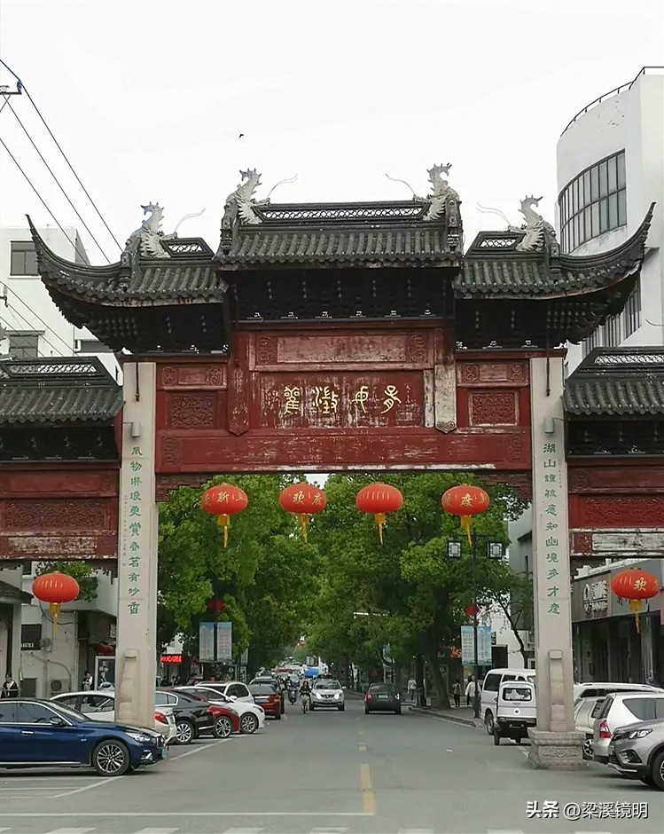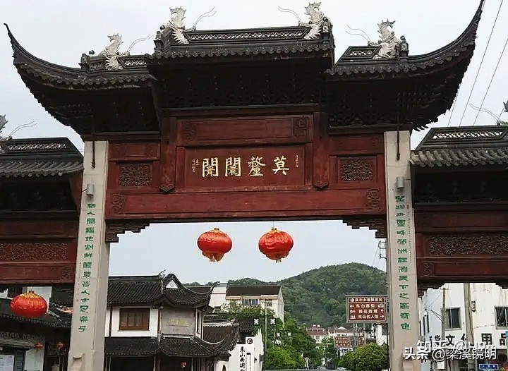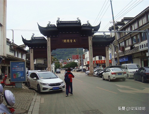 洞庭东山标志性牌坊,正面横额:“莫厘闤闠”,柱联:“望物外灵峰,萦洲枉渚,天下之至奇也;栖人间福地,割鲜醲農,吾人亦足乐乎”。“闤闠”意思:如同衣服的襟带一样紧密相连,现被用来指代店铺和商业活动。
