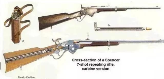 所谓的七响后膛枪,其实就是弹仓中可以装填七发,只需搬动上弹装置不用每一次都要装填弹药的连发枪,也就是西部电影里常见的那种枪托后面赛弹药的杠杠枪。德莱塞M1862式步枪斯,在当时被称为宾塞连珠枪,该枪采用黄铜壳边缘底火定装子弹,供弹系统是位于枪托内部的7发弹管,理论射速达甚至能达到每分钟21发。美国南北战争的时候,这种步枪在战场上是一种常见的武器,据说就连抢银行的匪徒手中,都有这种枪械的存在。