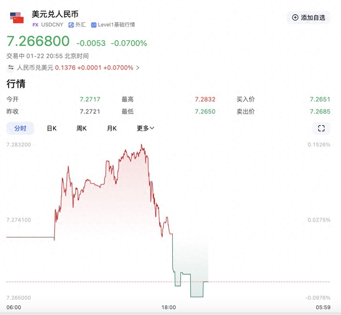 汇率怎么看?可以看下在岸人民币的汇率,旁边有一行字符:USDCNY,USD代表美元,CNY代表人民币,表示的意思就是1美元兑换7点多人民币。