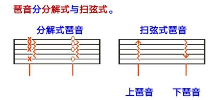 琶音是最简单的,也是最好认的波浪线加一个箭头。琶音的弹奏是一般大拇指向下拨弦,食指向上拨弦,手指只需要匀速的波动它所覆盖的弦就可以了。