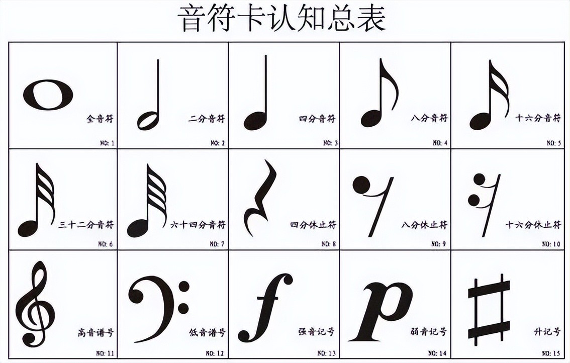 每个音符长得也不尽相同,分别有全音符、二分音符、四分音符、八分音符、十六分音符、三十二分音符,六十四分音符。