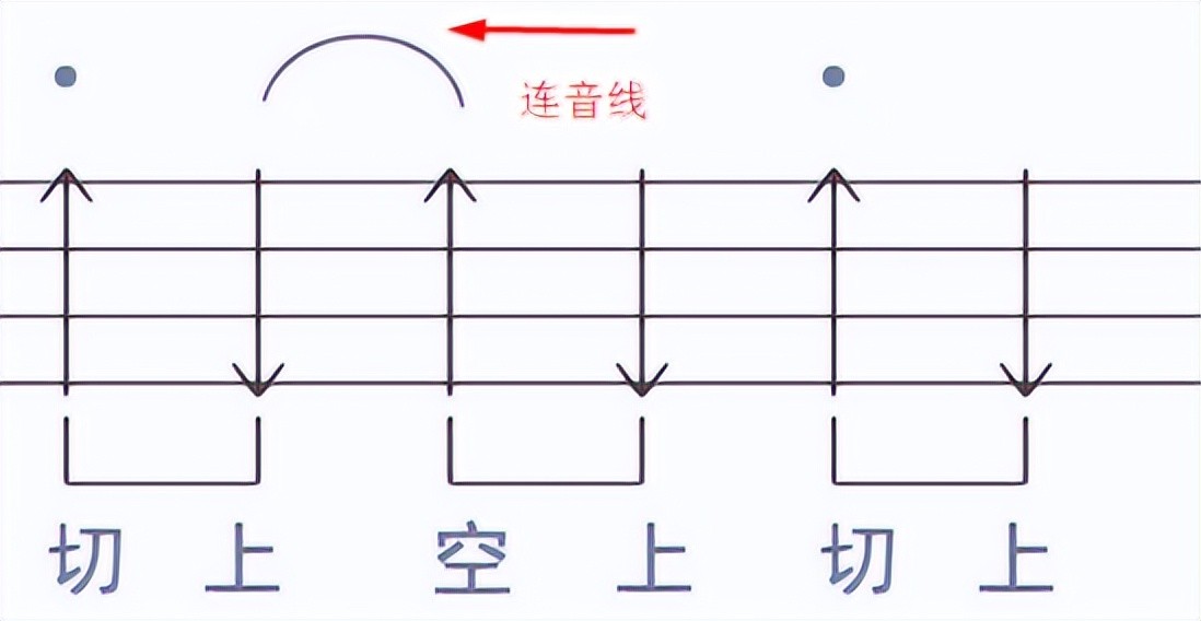延音线演奏时只弹前一个音,然后拍子延长到第二个音,即弹一下停留两个拍的时间。