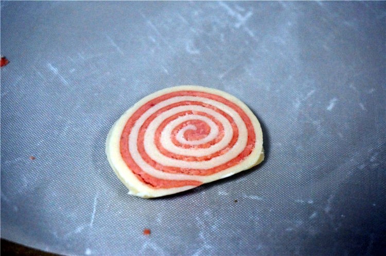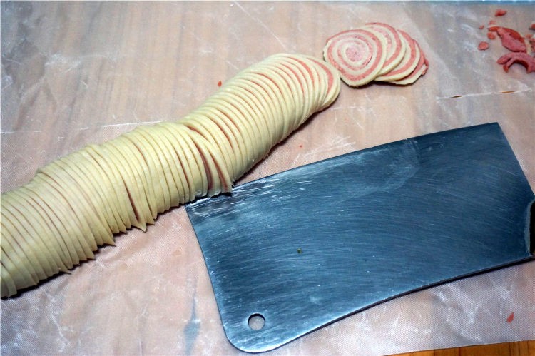 9把变硬的动起来坯料拿出来,用菜刀切成薄片,越切得薄吃起来越脆。(看看我的切片,一圈一圈很漂亮吧!)切好的牛耳朵片记得分别放开哦。