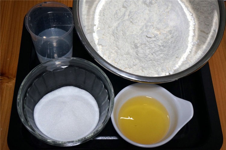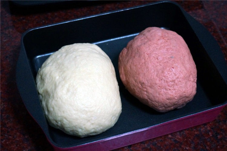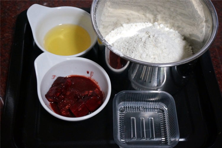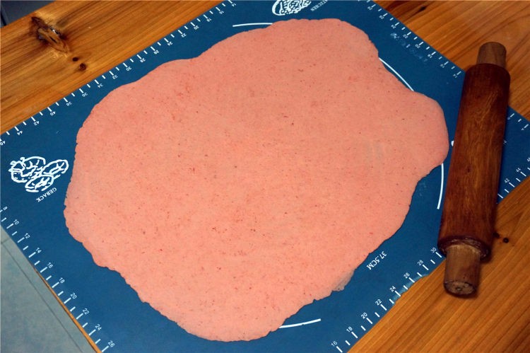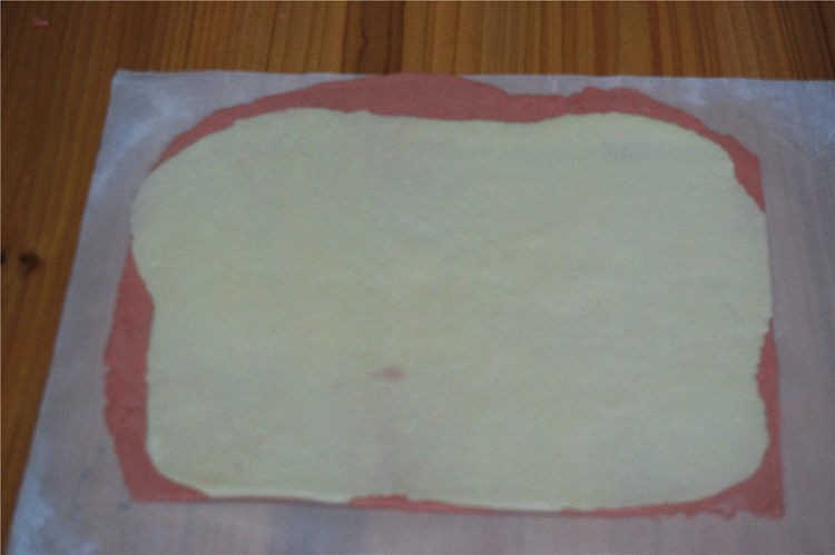 5同样,取三分之一的甜味面团,碾开成厚约2毫米的薄片。