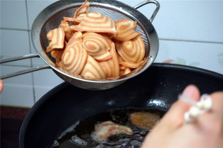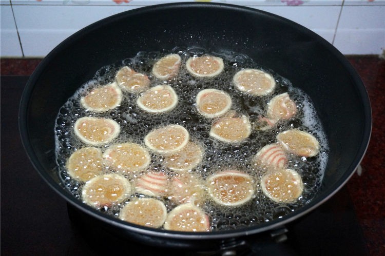 10油锅中放适量的油,烧热至七八成热。快手把薄片放入油锅中,不要放太多,分次放入使锅中铺满即可。刚开始放入后不要翻动,待变硬身后才翻动。
