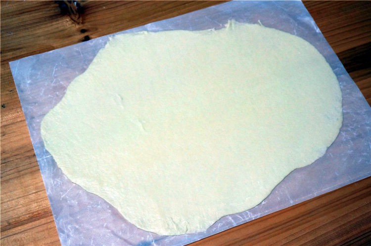 4取三分之一的咸味面团,碾开成厚约2毫米的薄片。
